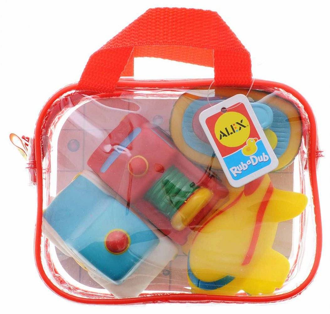 - Он включает в себя четыре игрушки, предназначенные для игр в воде, аккуратно упакованные в прозрачную сумочку с ручками, застегивающуюся с помощью замка-молнии.