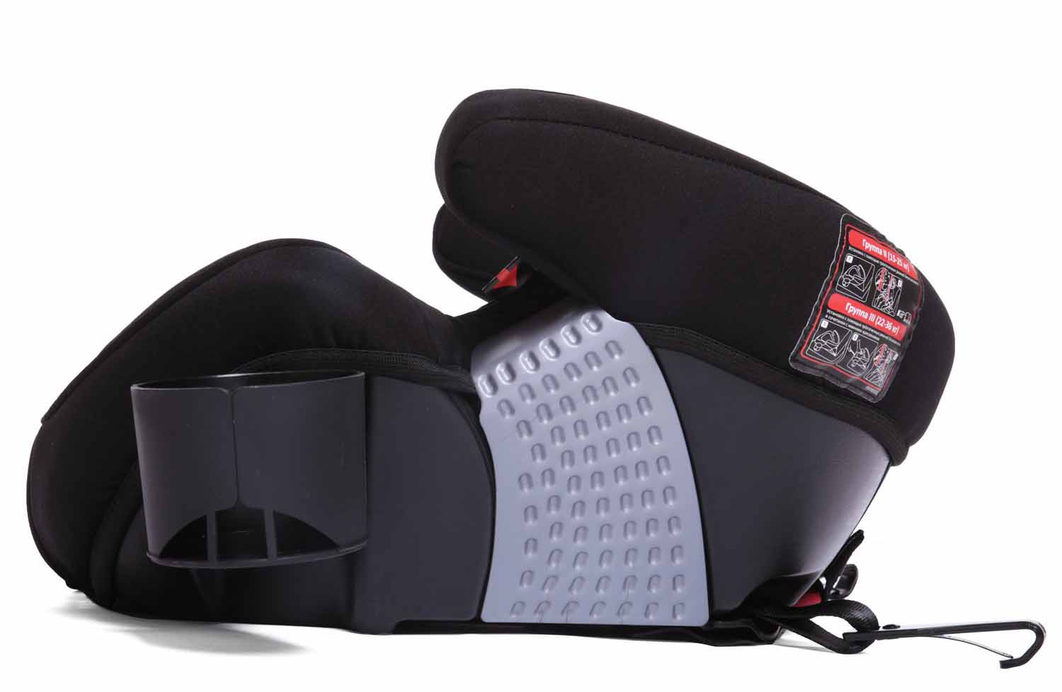 - Чтобы его обнаружить, пожалуйста, переверните бустер. Подстаканник закреплен под сидением бустера