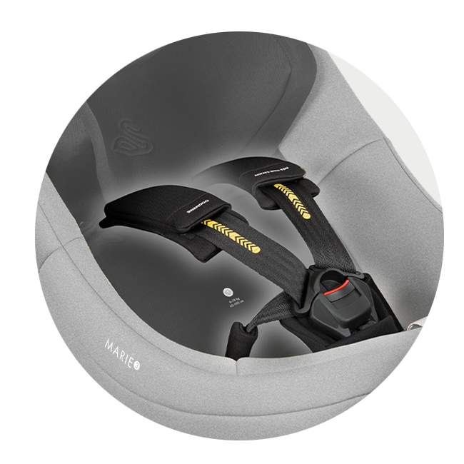 Для того чтобы родители не могли неправильно использовать ремни, на кресле разработана система Harness+, которая поможет вам правильно отрегулировать натяжение ремней безопасности автокресла, когда вы фиксируете в нем ваш самый ценный груз. Marie не позволит вам ошибиться никогда!