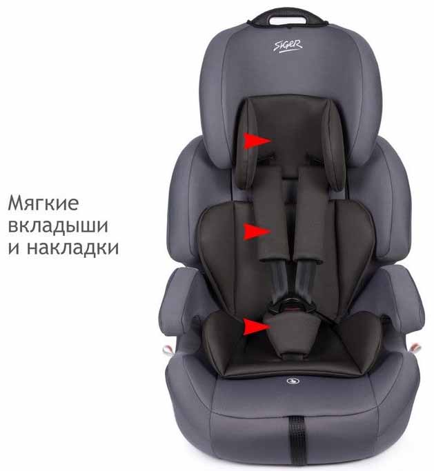 - Мягкий подголовник, спинка и накладки внутренних ремней увеличивают уровень комфорта