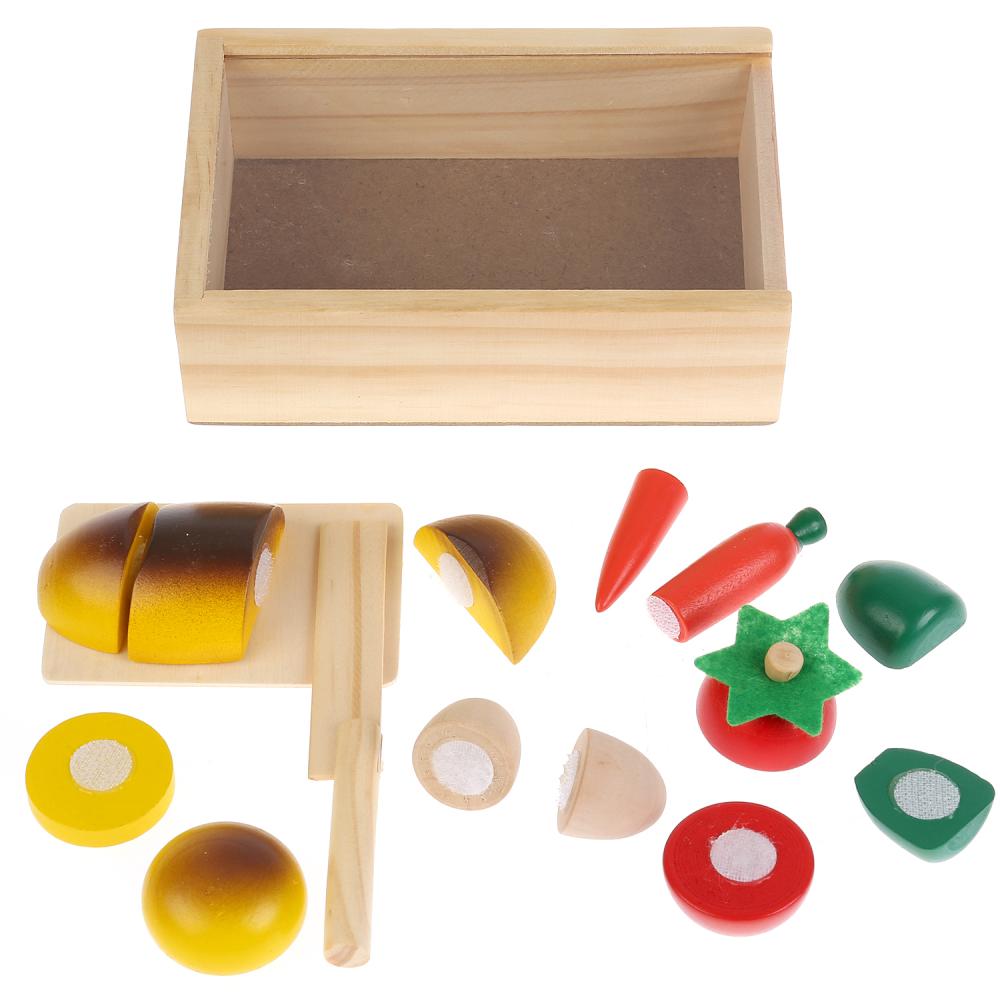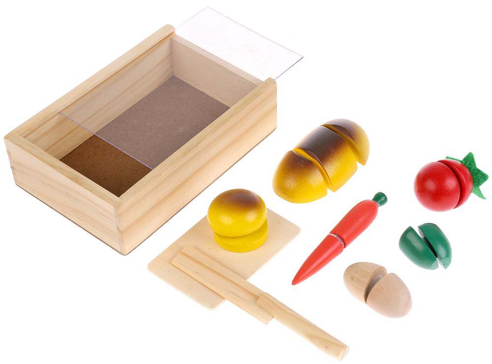 Деревянные овощи из набора состоят из 2 частей, которые склеиваются между собой липучками. Их можно "разрезать" при помощи деревянного ножа из набора.Особенности:
