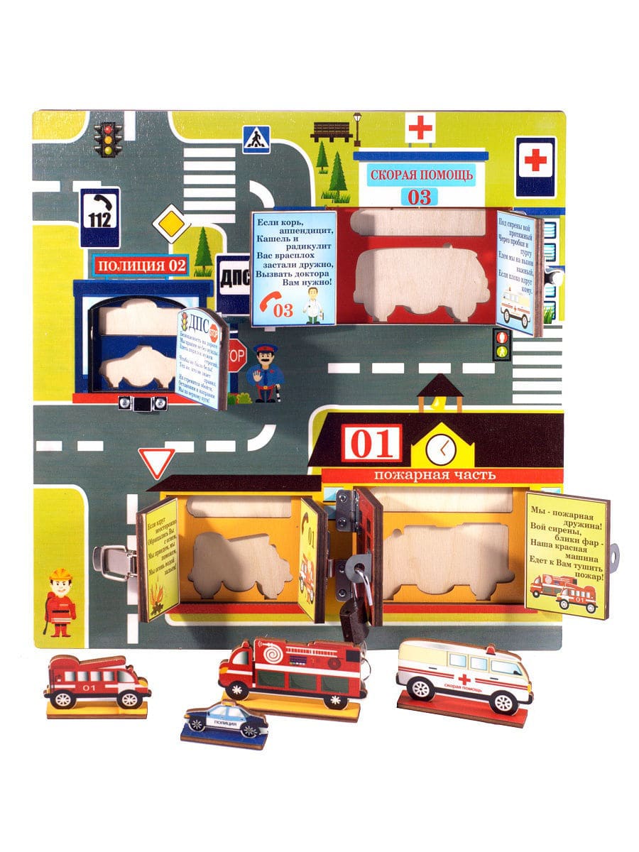 Эта оригинальная доска выполнена в виде помещений различных служб спасения. Каждая служба закрыта на замок, который нужно открыть и поставить подходящую машинку.