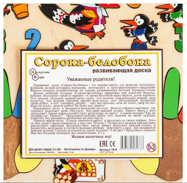 Деревянная доска "Сорока-белобока" - это игровая панель для развития тактильных функций, мелкой моторики, внимания, логического и пространственного мышления Вашего малыша, разработанная на основе развивающих методик Эдуарда Сегена.Как играть?