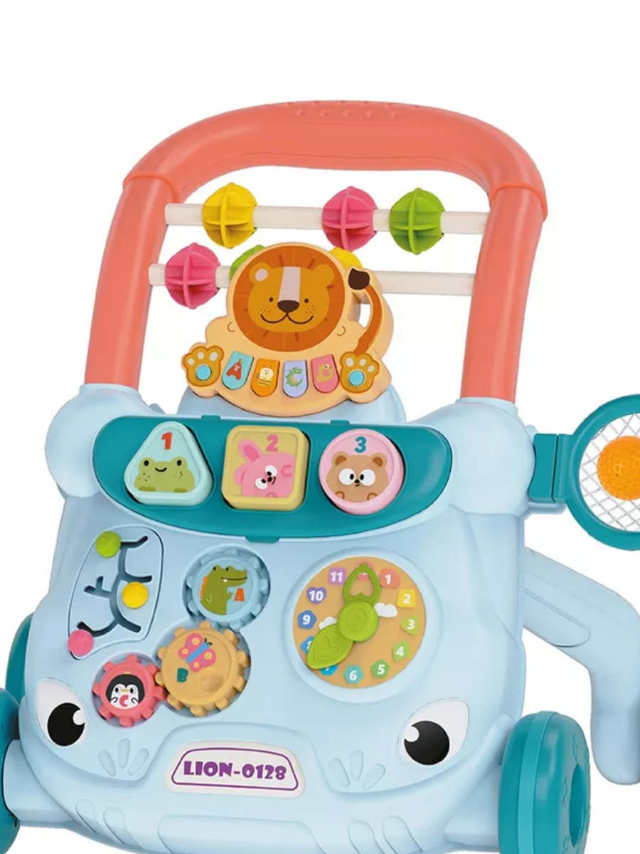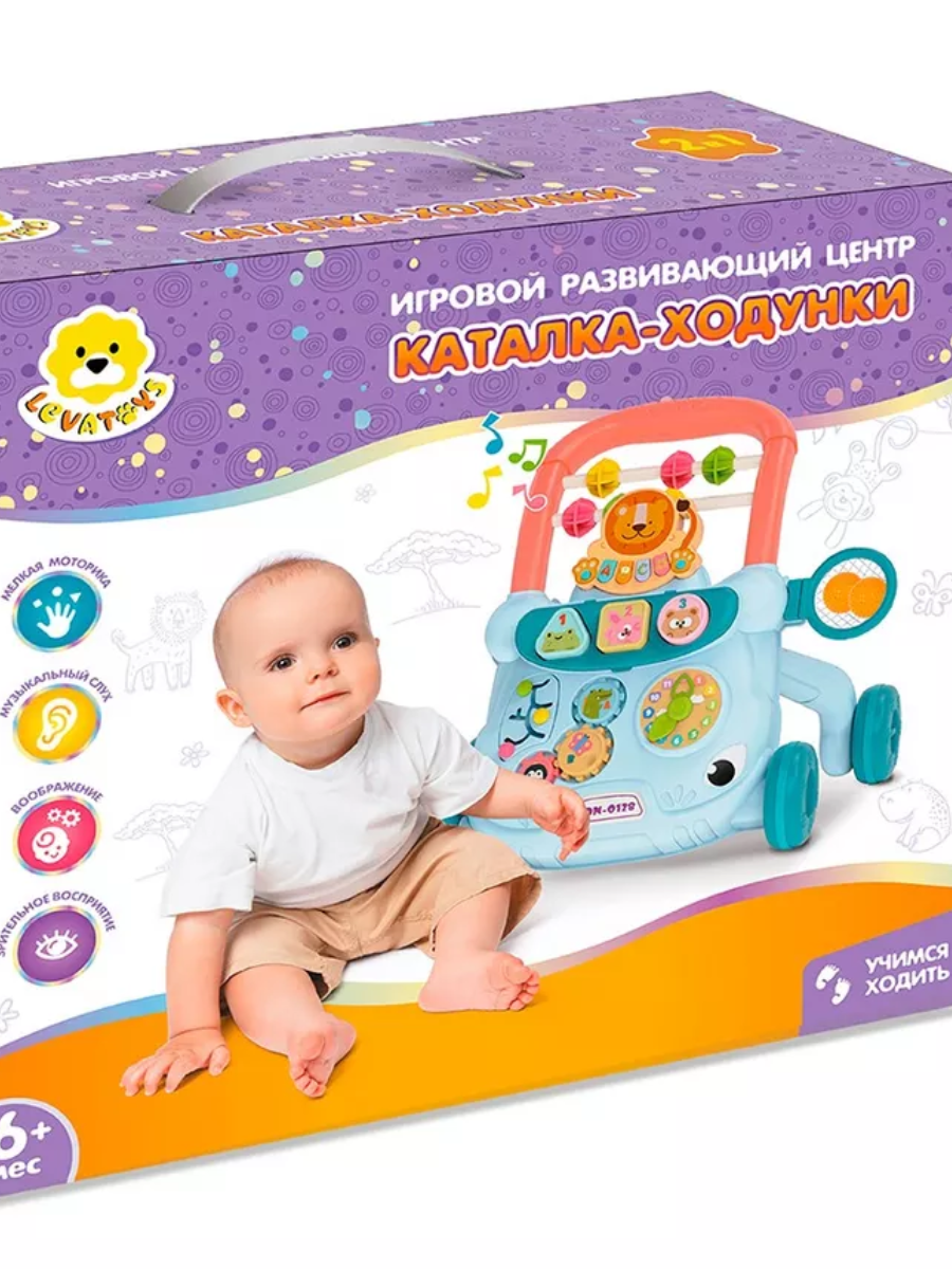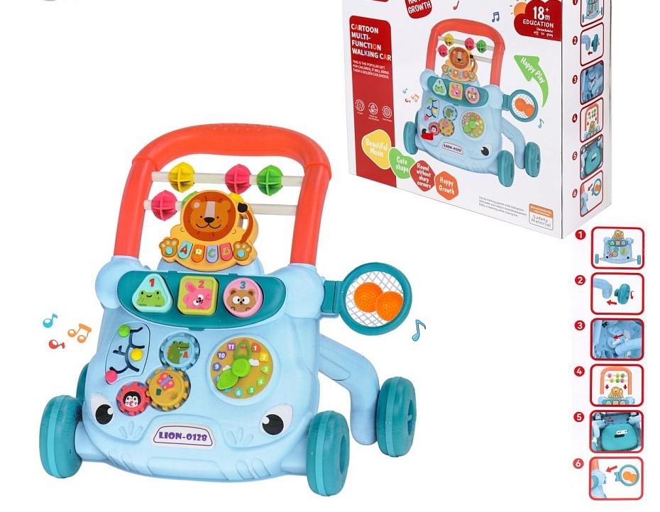 Развивающий центр-ходунки —это прекрасная игрушка для малышей, которая поможет им сначала научиться стоять, а затем и научиться ходить. Конструкция устойчива от опрокидывания за счёт низко расположенного центра тяжести - ёмкости для воды. Есть регулировка скорости вращения колес, регулирование громкости. Игровая панель детской каталки включает в себя множество разных интересных элементов. Она состоит из развивающих и развлекательных игр таких как: весёлые шестерёнки, съёмные фигурки-сортеры, съёмное, музыкальное пианино-львёнок (на батарейках), часы со стрелками, лабиринта, баскетбольного кольца с мячиками. Игры с развивающими ходунками способствуют развитию мелкой моторике, логического мышления, тренируют память. Ходунки выполнена из качественного и безопасного пластика, пианино работает от 2-х батареек типа "ААА" (в комплект не входят).Характеристики: