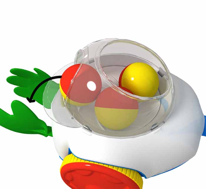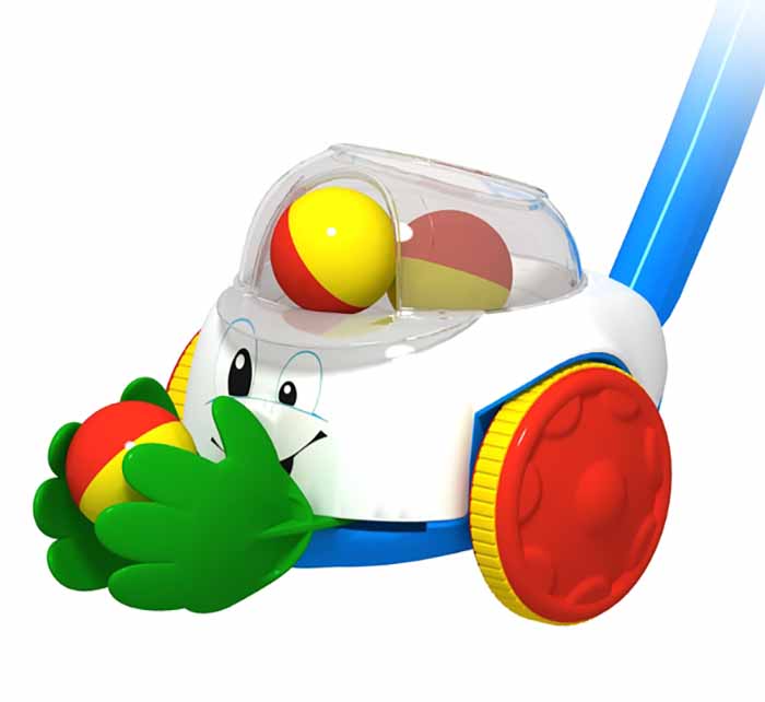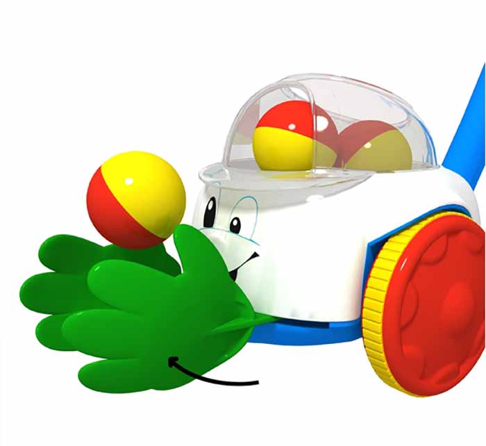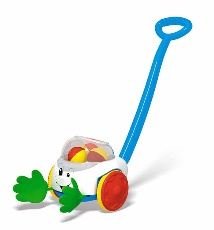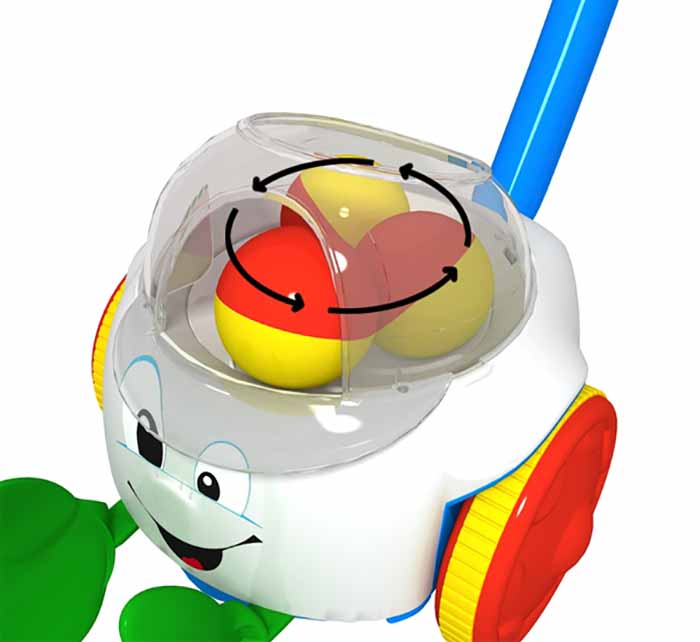 - Держа перед собой удобную ручку каталки, ребенок сможет наблюдать, как внутри каталки кружатся шарики, как они весело выпрыгивают, и будет стараться схватить их ладошками каталки.