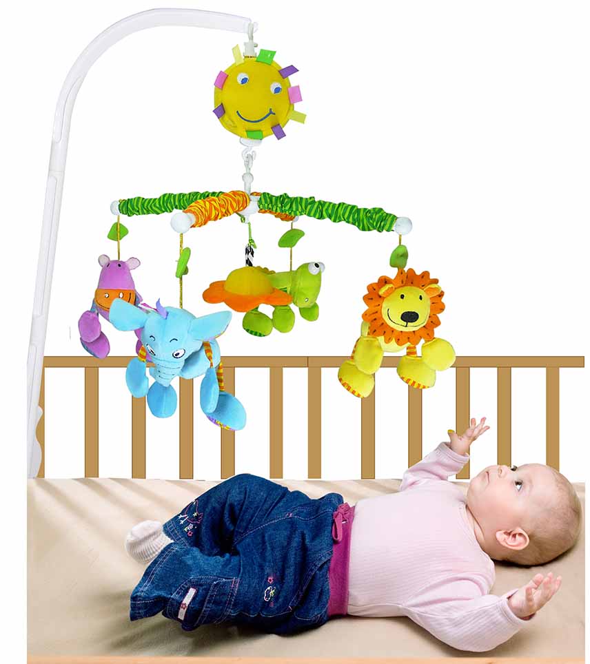 Музыкальный мобиль с яркими и мягкими набивными игрушками. Подходит для детей с рождения.Особенности: