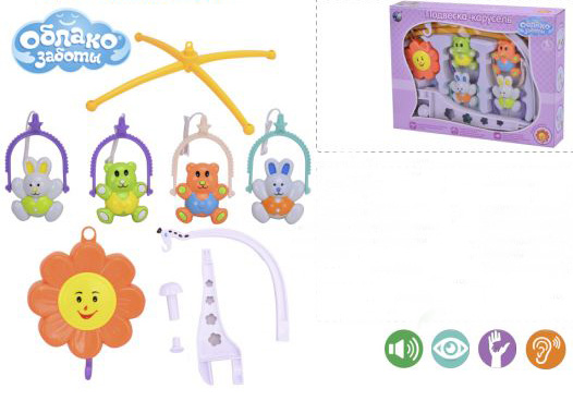 Музыкальный мобиль с погремушками на подвеске станет любимой забавой малюток с рождения. Мобиль надёжно фиксируется на кроватку, люльку или коляску при помощи винтового крепления. К центральной части крепится карусель с яркими фигурами зверей-погремушек.Игрушка легко вращается и издаёт мелодичную приятную музыку.
