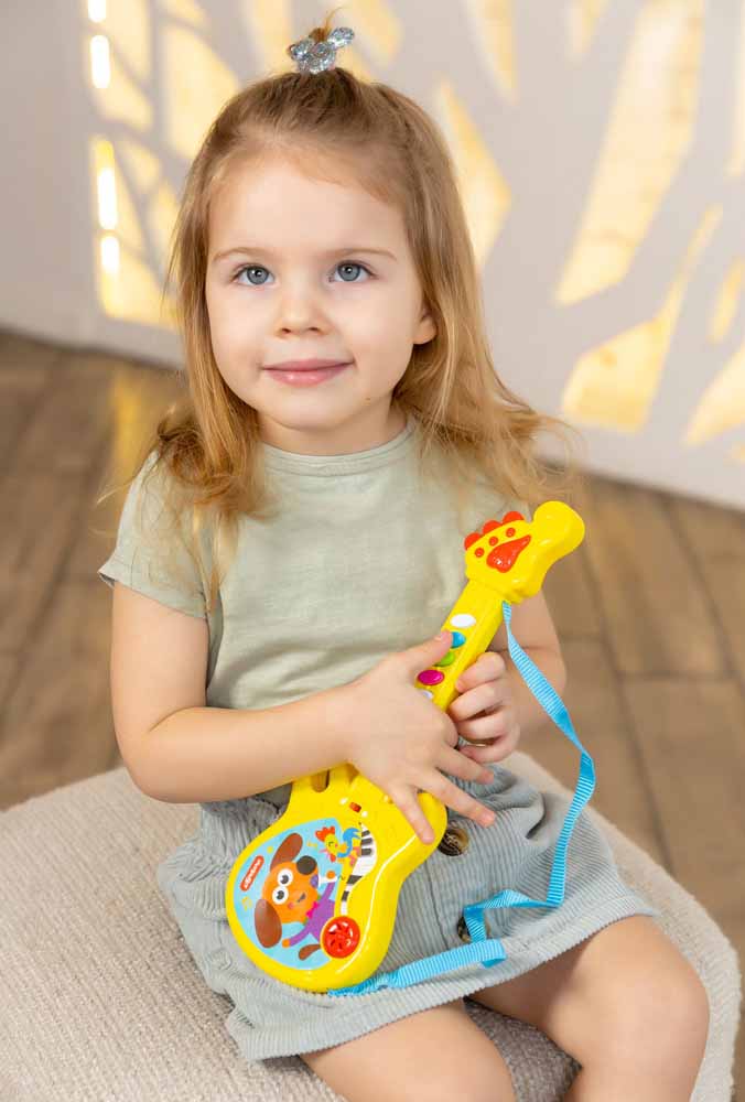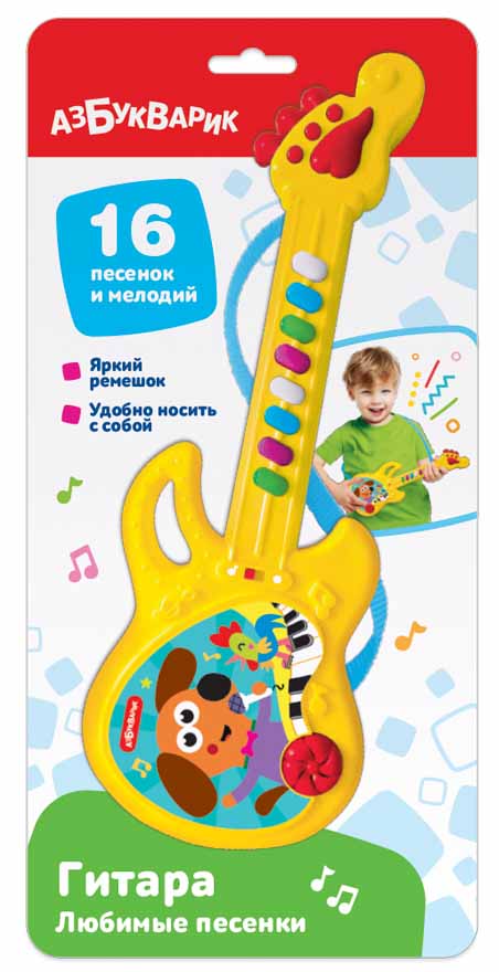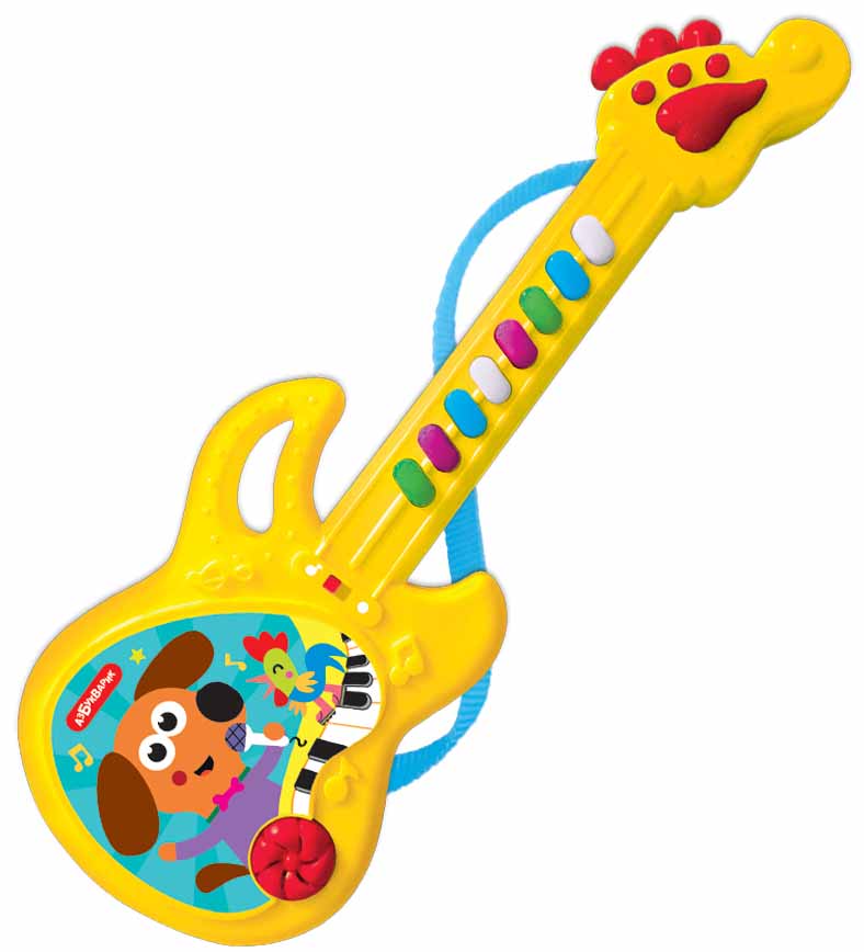 Эта игрушечная гитара отличается оригинальным дизайном – она выглядит, как настоящая гитара для профессиональных музыкантов! Дети будут в восторге!Нажимая на разноцветные кнопочки на грифе гитары, ребенок послушает детские хиты в современной аранжировке: 8 песенок («Чунга-чанга», «Песня Львёнка и Черепахи», «Весёлые путешественники», «Весёлая карусель», «Какой чудесный день!», «Во дворе играл щенок», «Ждет лошадка малышей», «Два весёлых гуся») и 8 мелодий («Арам зам зам», «Улыбка», «Чижик-пыжик», «Калинка», «Песенка про кузнечика», «Собачий вальс», «Песенка фермера», «Танец маленьких утят»)