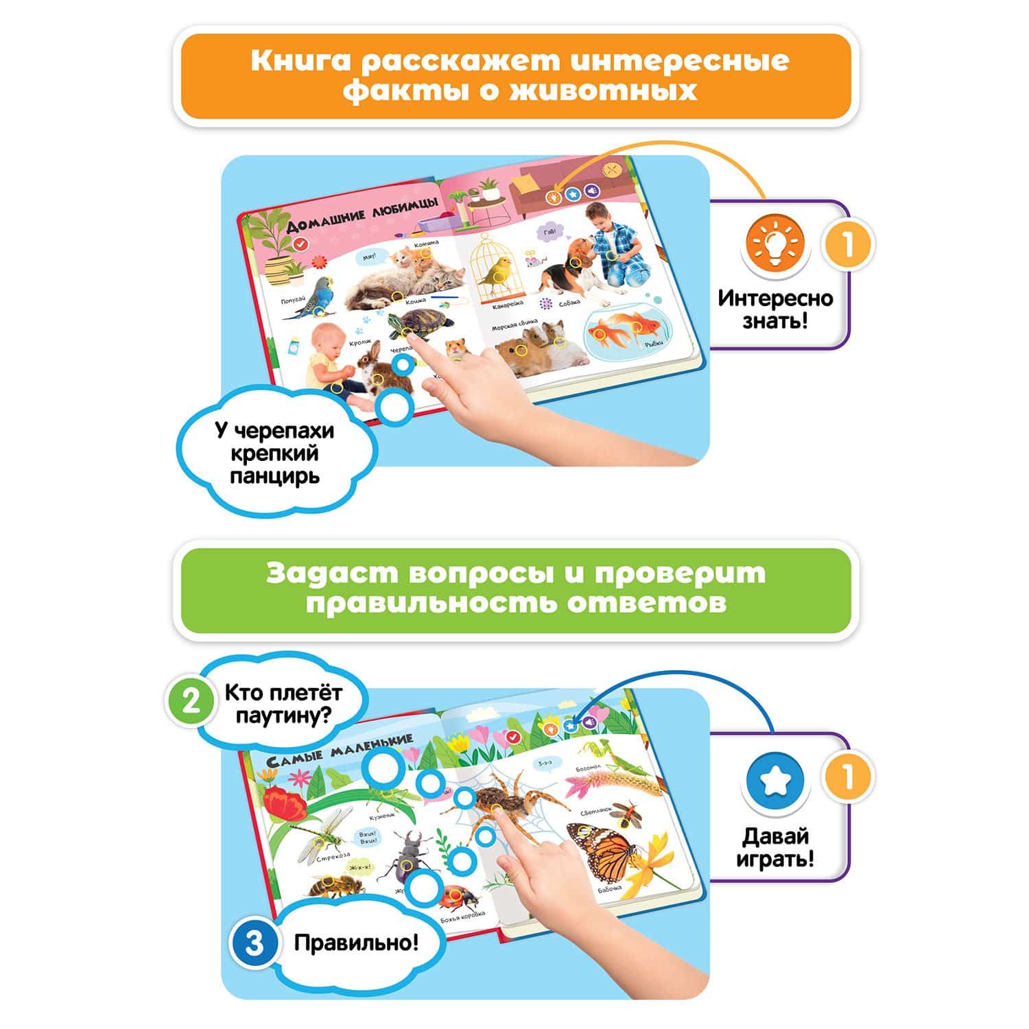 - Все страницы интерактивные: нажимайте на страницы, слушайте звуки, выполняйте задания, узнавайте интересные факты.