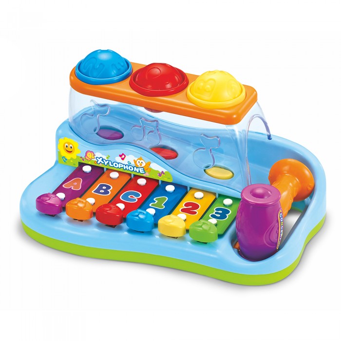 - Эта музыкальная игрушка позволит малышу развлекаться, нажимая на музыкальные клавиши или стуча по ним молоточком