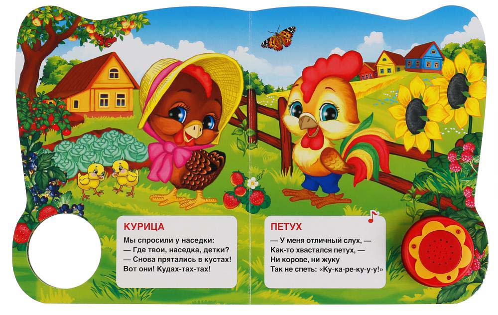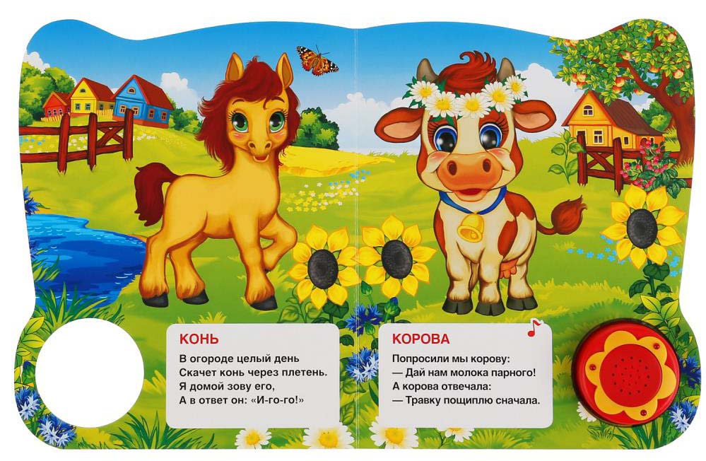 Красочная музыкальная книга для малышей. Весёлые песенки сделают чтение книги ещё более увлекательным. Ребёнок легко освоит включение звука: по нажатию на кнопку звук включится, при втором нажатии выключится.Особенности: