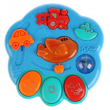 - Игрушка выполнена в виде необычного музыкального инструмента, на котором размещены объемные фигурки транспортных средств и разноцветные клавиши с картинками животных.