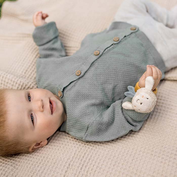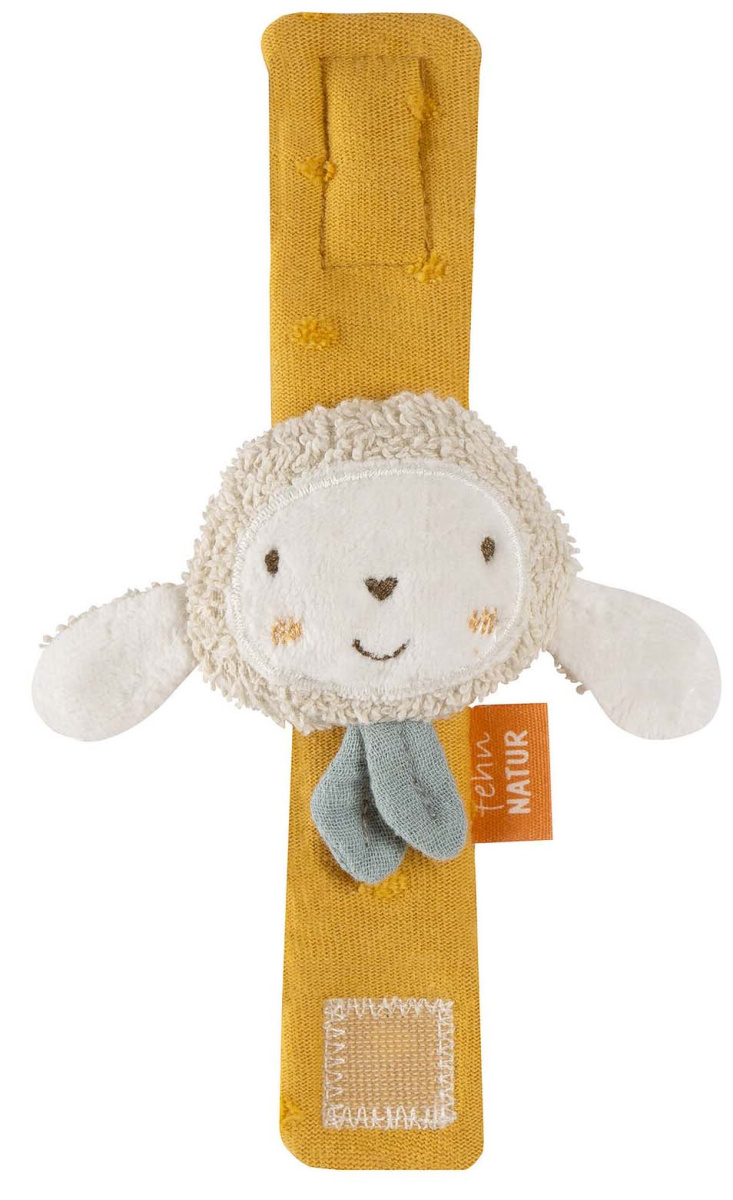 - Наденьте браслет на ручку и малыш будет встряхивать его, чтобы игрушка издавала веселый звук