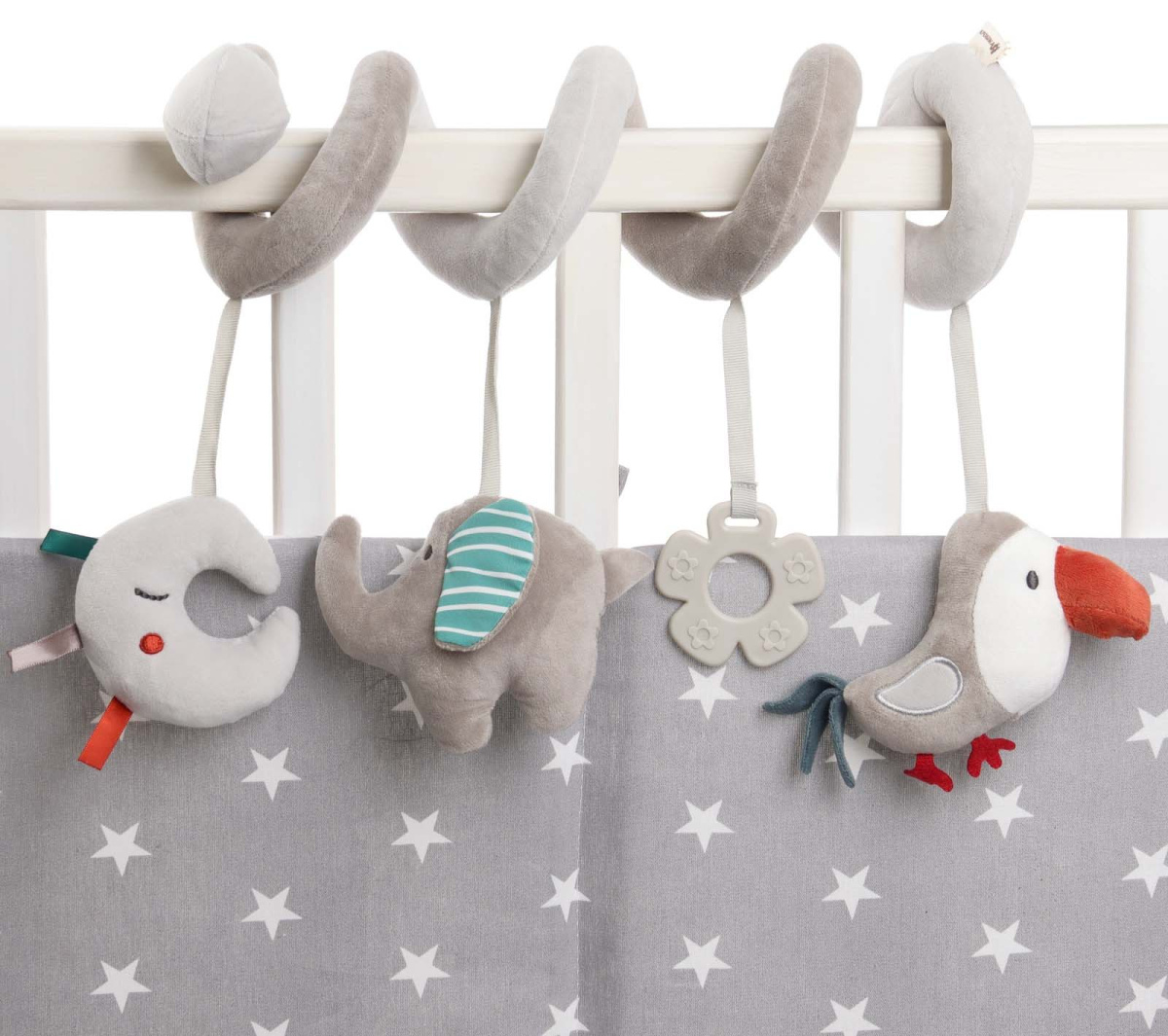 - Мягкую и гибкую растяжку можно обмотать вокруг бортика кроватки, ручки автокресла, бампера коляски
