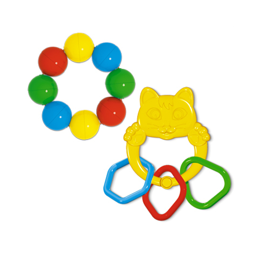 Комплект:погремушка из 8 шариков, пластиковый котик, 3 колечка.