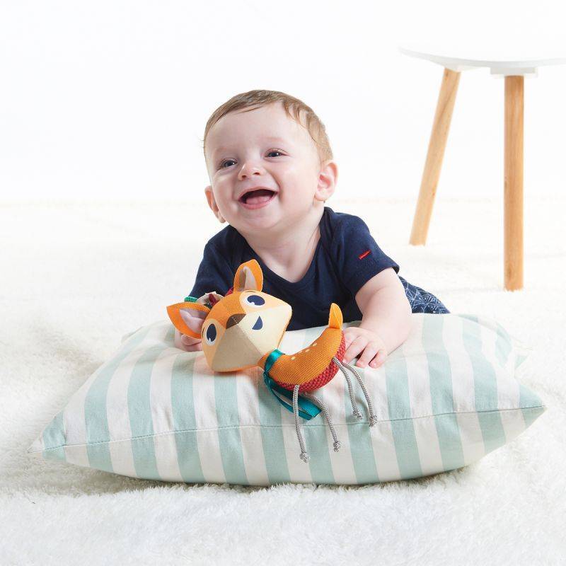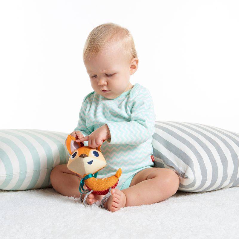 - Хватательный рефлекс ребенка исчезает, а контроль над движениями рук улучшается, что позволяет ему тянуться к игрушке дергать ее, вызывая звуки. Веселая функция игры в прятки может помочь ребенку сделать его первые шаги в понимании постоянства объекта. Используйте крепление, чтобы прикрепить к детской коляске, автокреслу или кроватке.