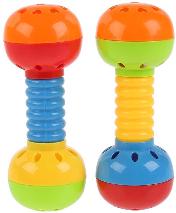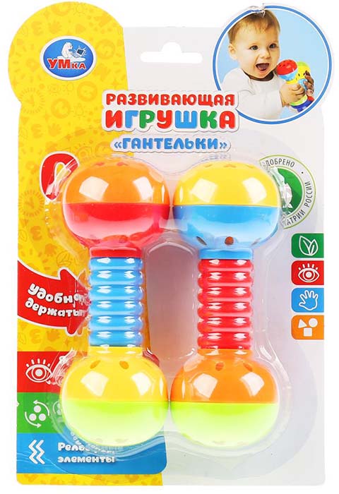 Погремушка в виде гантелек - замечательный подарок для ребёнка. Способствует развитию слуха, зрения, фантазии и воображения, мелкой моторики ребёнка. Одобрена Институтом педиатрии России.Особенности: