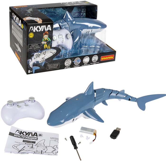 Запусти свою акулу в ванну, бассейн, водоем и управляй ее движениями при помощи пульта управления! Акула реалистично плавает под водой в любом направлении!Особенности: