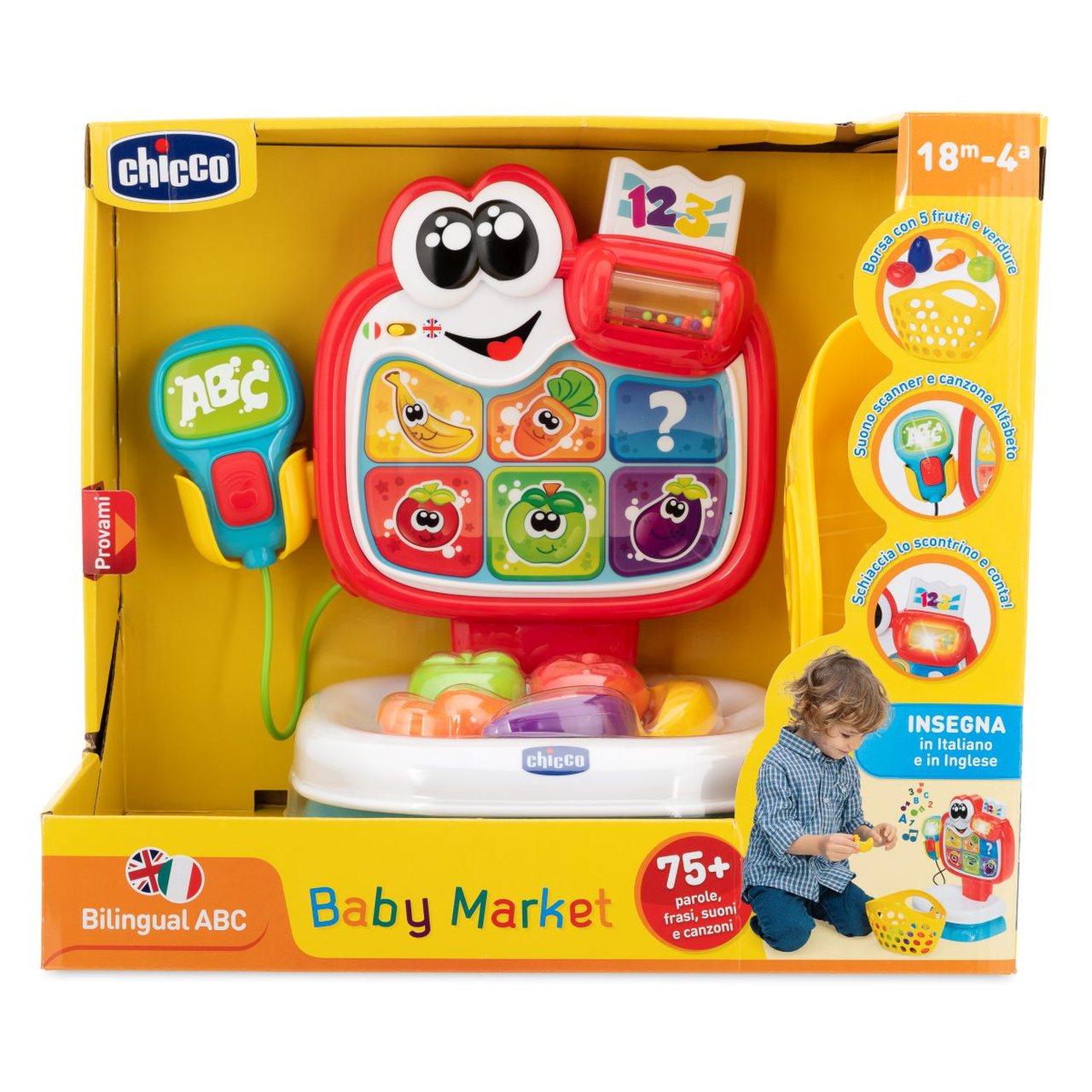Baby Market — это двуязычный игровой центр, который сочетает в себе электронные и механические активности. малыш может пойти за покупками, совсем как мама и папа, взвесить овощи и фрукты и услышать рассказы о них на русском и английском языках.