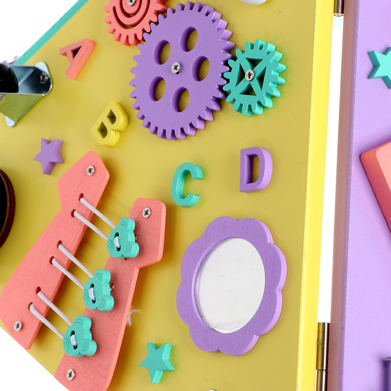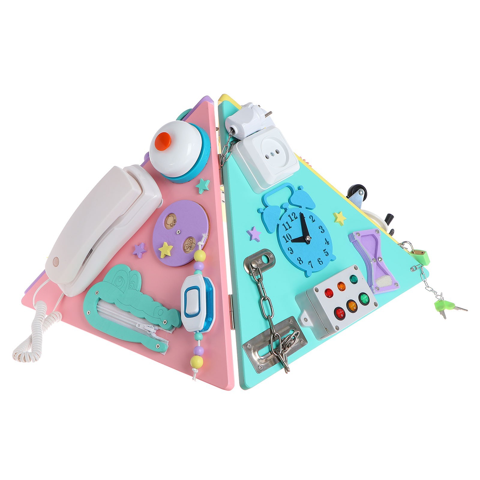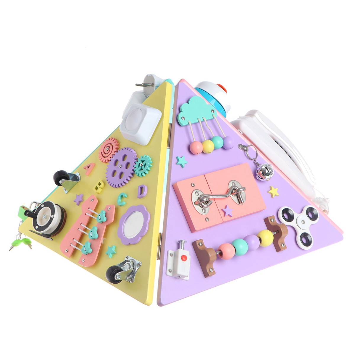 Развивающий центр «Пирамида» — это многофункциональная игрушка для детей от 3 лет, выполненная в форме треугольного бизиборда. Она сочетает в себе элементы колокольчика, шестерёнок, розетки, молнии и крючка, что делает её универсальной для игр и обучения. Идеально подходит для домашнего использования и занятий в детских садах.Особенности: