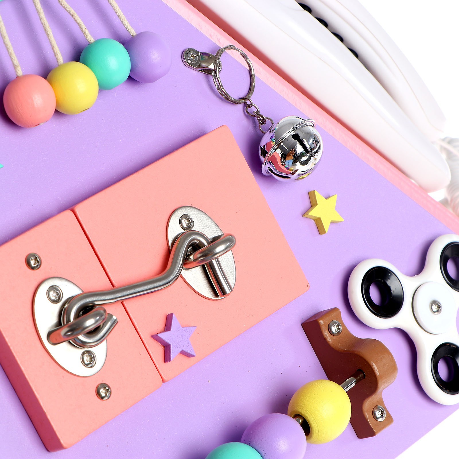- Состав бизиборда: Колокольчик, Крючок, Розетка, Молния, Шестерёнки