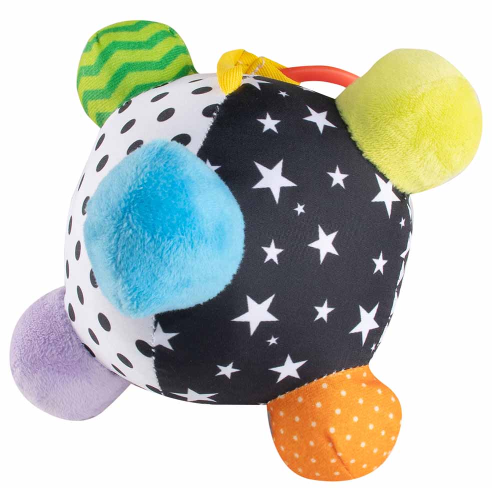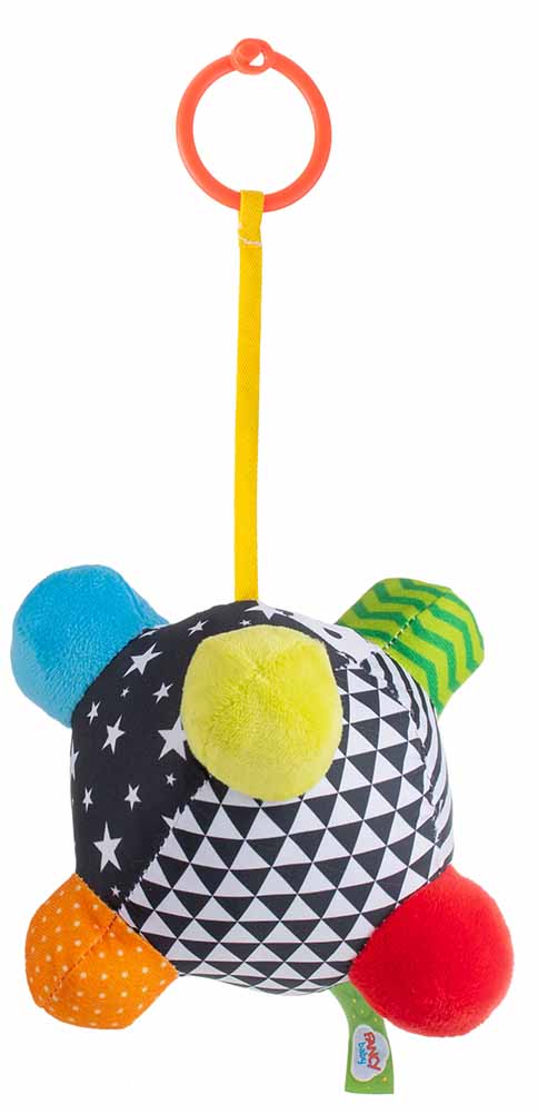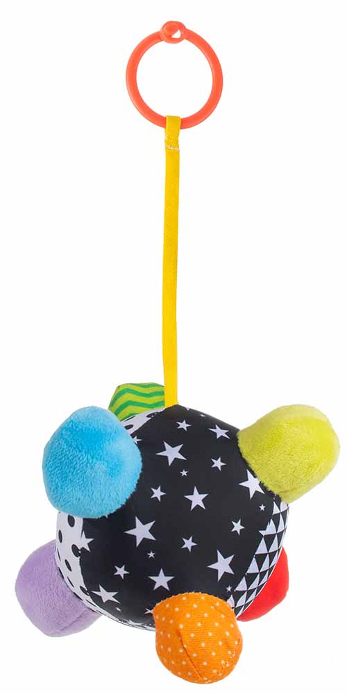 - Яркий мячик стимулирует ребенка хватать и держать его маленькими пальчиками