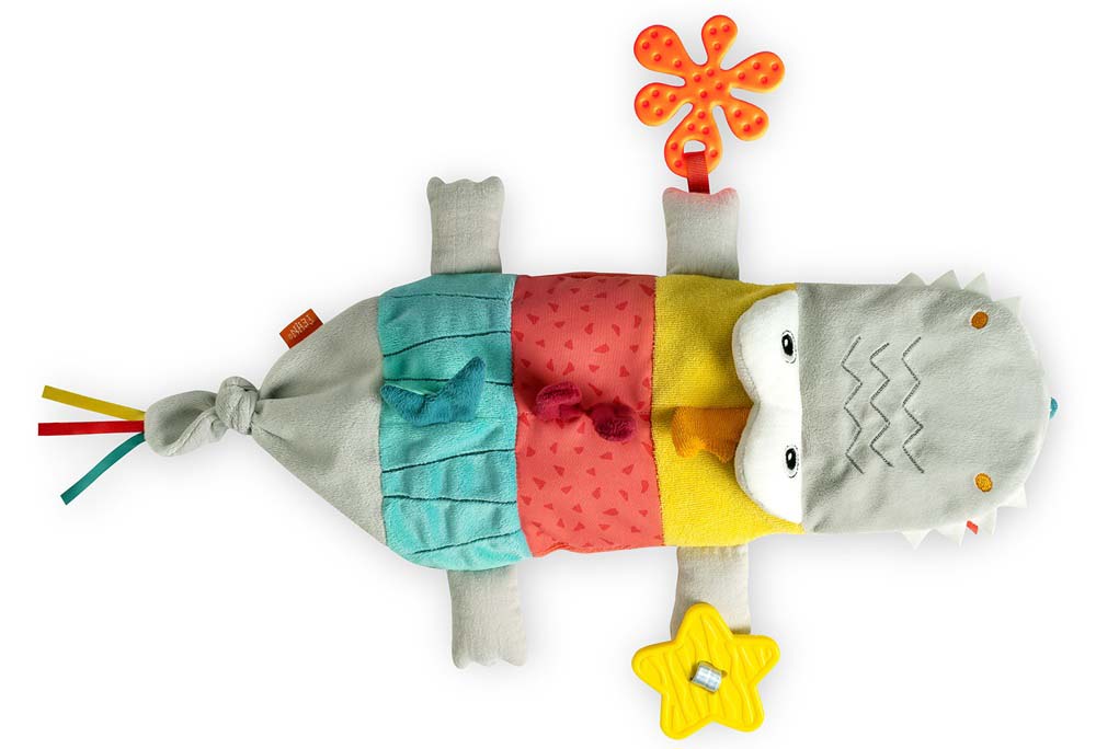 - Яркие цвета, встроенная погремушка, пищалка, сочетание различных текстур ткани