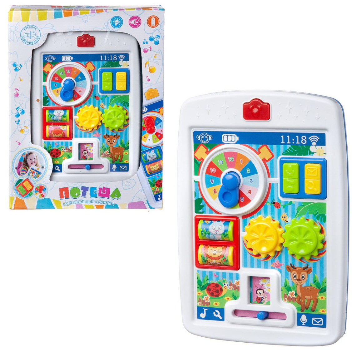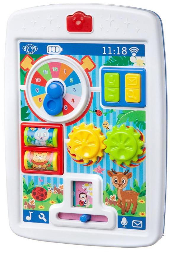 Музыкальный планшет "Потеша" - это развивающий центр, который принесет радость и удовольствие вашему малышу. С помощью этого интерактивного игрушечного планшета он сможет не только весело провести время, но и развить свои навыки и умения. Малыш сможет крутить шестеренки и барабанчики, нажимать на кнопку селфи-камеры, изучать время, вращая стрелку-трещотку на часах. А еще, переведя переключатель внизу в правое положение, он сможет слушать увлекательные сказки, а переведя его влево - услышит веселую песенку. Эта игрушка станет отличным способом разнообразить игровой процесс и обогатить детское развитие