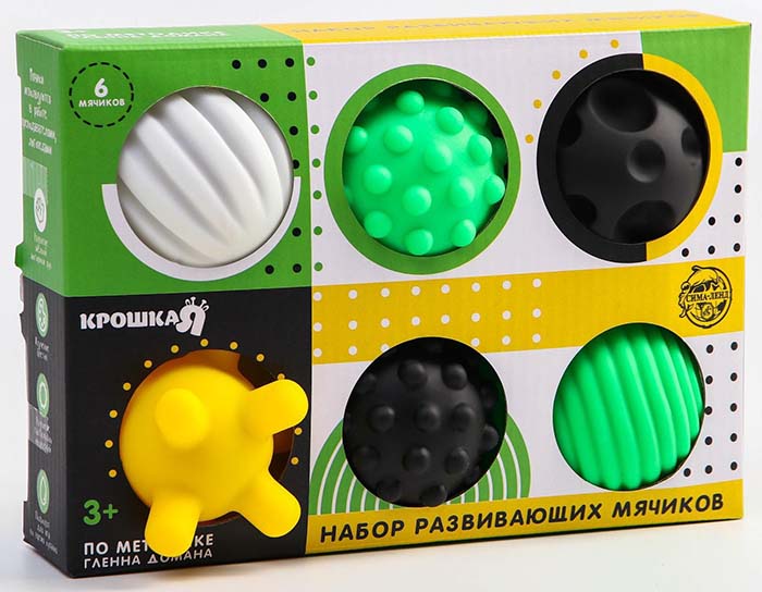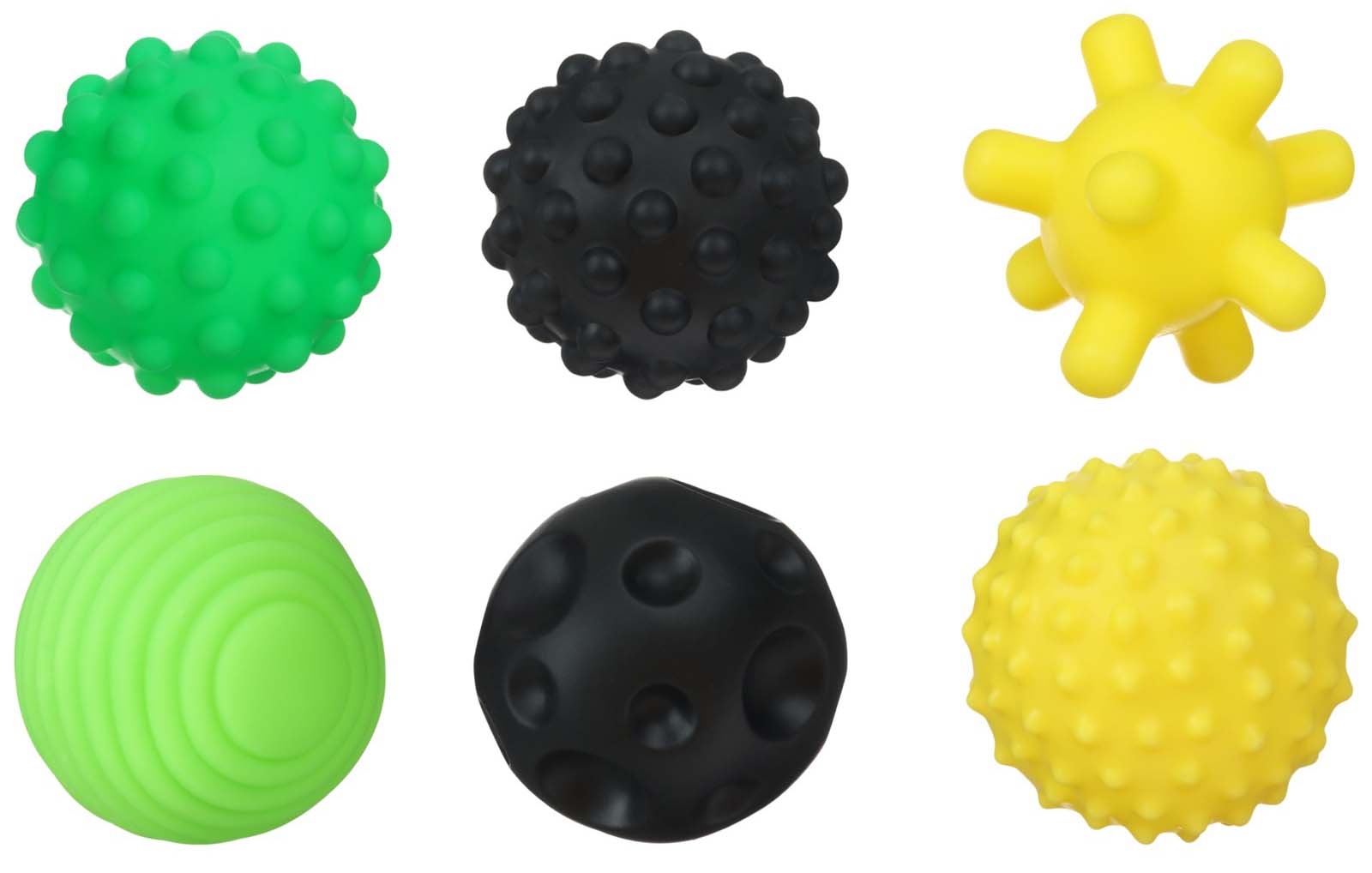 Мячики с рельефной массажной поверхностью способствуют развитию мелкой моторики и тактильных ощущений. Шарики имеют яркие цвета, которые стимулируют развитие зрения, а пищалка внутри развивает слуховое восприятие. В наборе 6 тактильных мячиков.Варианты игр: