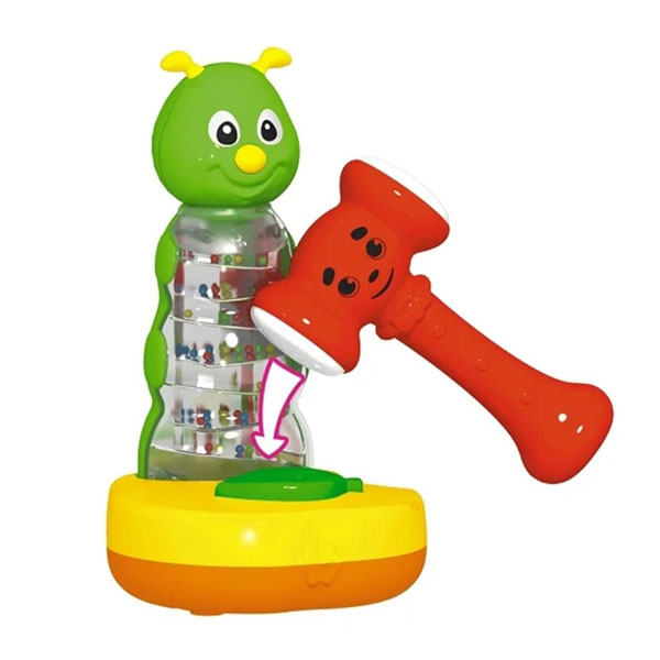 Малыши обожают чем-то по чему-нибудь стучать, и Гусеничка будет как нельзя кстати. Если ударить молоточком по кнопочке-листику, раздастся смешной звук, а внутри игрушки будут прыгать разноцветные шарики. Это отличный способ обуздать неиссякаемую энергию ребенка. Нос и рожки гусенички мягкие, гибкие, приятные на ощупь.Играя, малыш учится различать цвета, понимать и наблюдать причинно-следственные связи: ударил кувалдочкой – посыпались яркие шарики. Также развиваются координация движений, моторика рук, ловкость и игровые навыки. Все детали покрыты гипоаллергенной краской, устойчивой к истиранию.