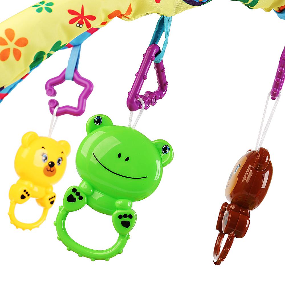 Яркий и красочный игровой коврик – очень удобное и ценное приобретение для детской комнаты. Милые изображения животных на коврике понравятся и мальчикам, и девочкам. Приятный на ощупь и достаточно плотный и согревающий материал позволяет малышам с удовольствием ползать, ходить, лежать, сидеть и играть на коврике.Функционал развивающего коврика с игрушками 3 в 1: