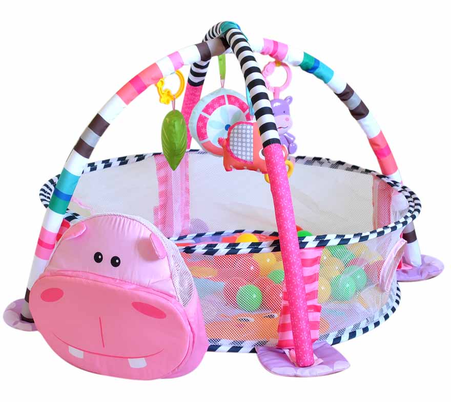 Развивающий коврик выполнен из безопасных высококачественных материалов. Ваш малыш откроет для себя мир, полный новых тактильных ощущений, сочных красок, ярких образов и звуков!Можно лежать на спине, ползать на животе, сидеть как в манеже и развиваться в компании веселых друзей. Разноцветные шарики хранятся в специально предназначенном контейнере в виде головы бегемотика. Развивающий коврик станет замечательной первой игрушкой для вашего малыша.