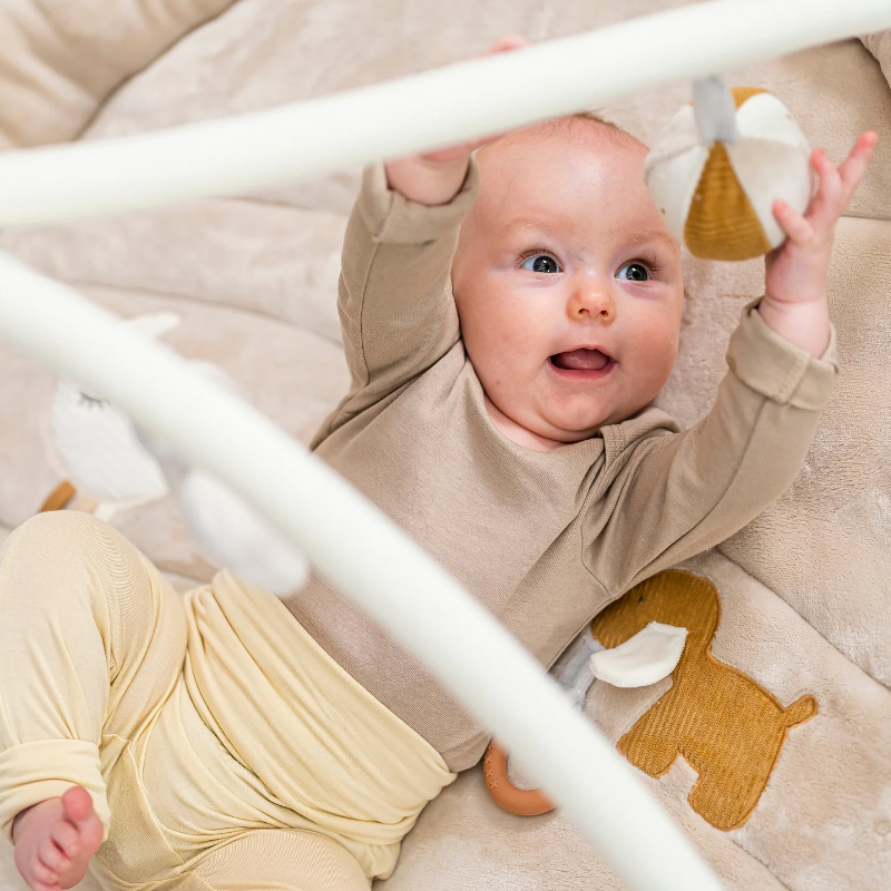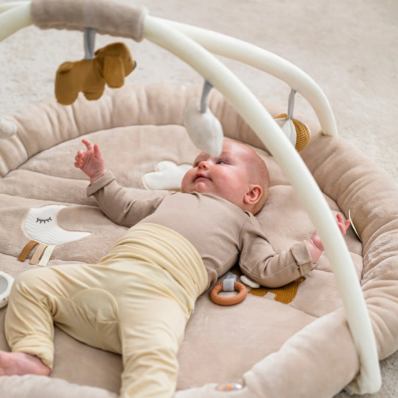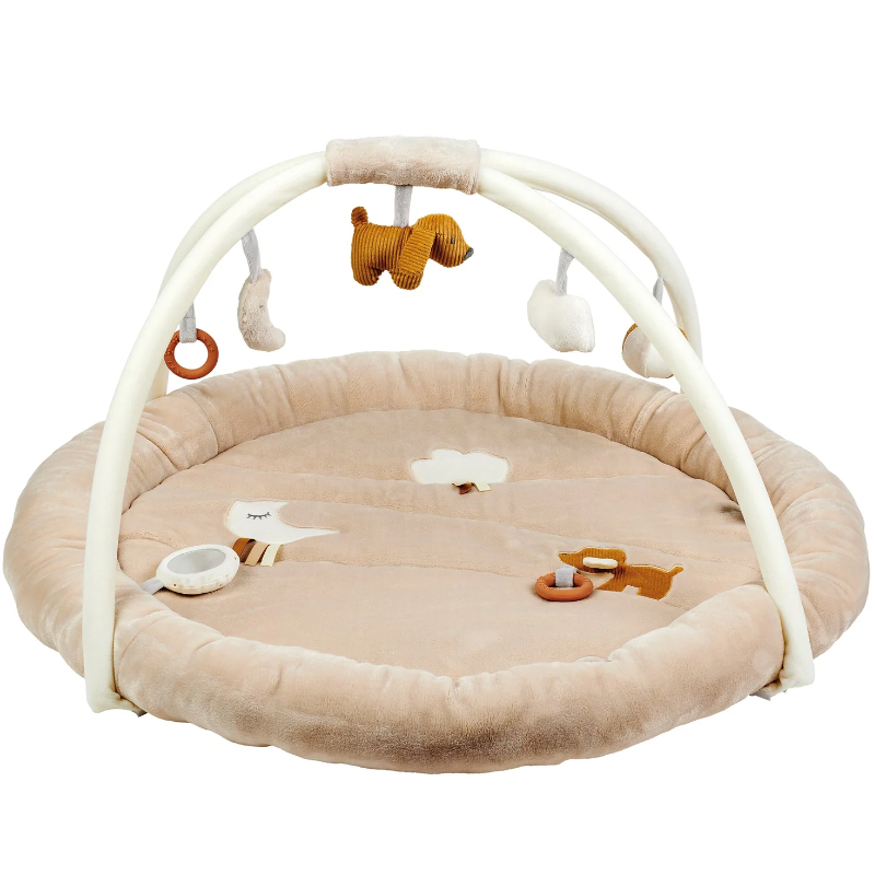 Игровой коврик Charlie dog особенно мягкий и пушистый, с дополнительной подкладкой по краям, чтобы вашим малышам было комфортно во время игры. Прилагаемые дуги и сам игровой коврик предлагают всевозможные занятия, будь то сидение, лежание или ползание. Шуршание бумаги, погремушка, зеркальце и другие занятия пробуждают любопытство и чувство открытия. Чтобы малыши могли слышать, чувствовать, ползать и хвататься за предметы в своем собственном маленьком игровом мире.
