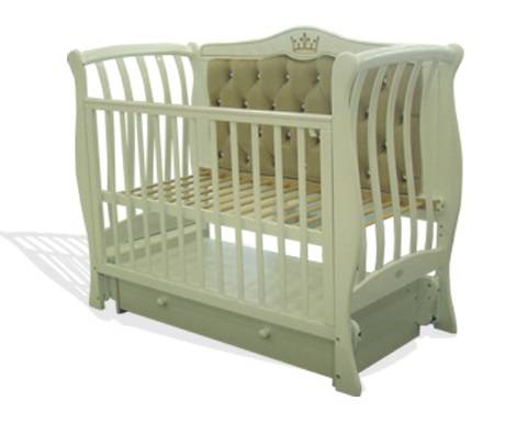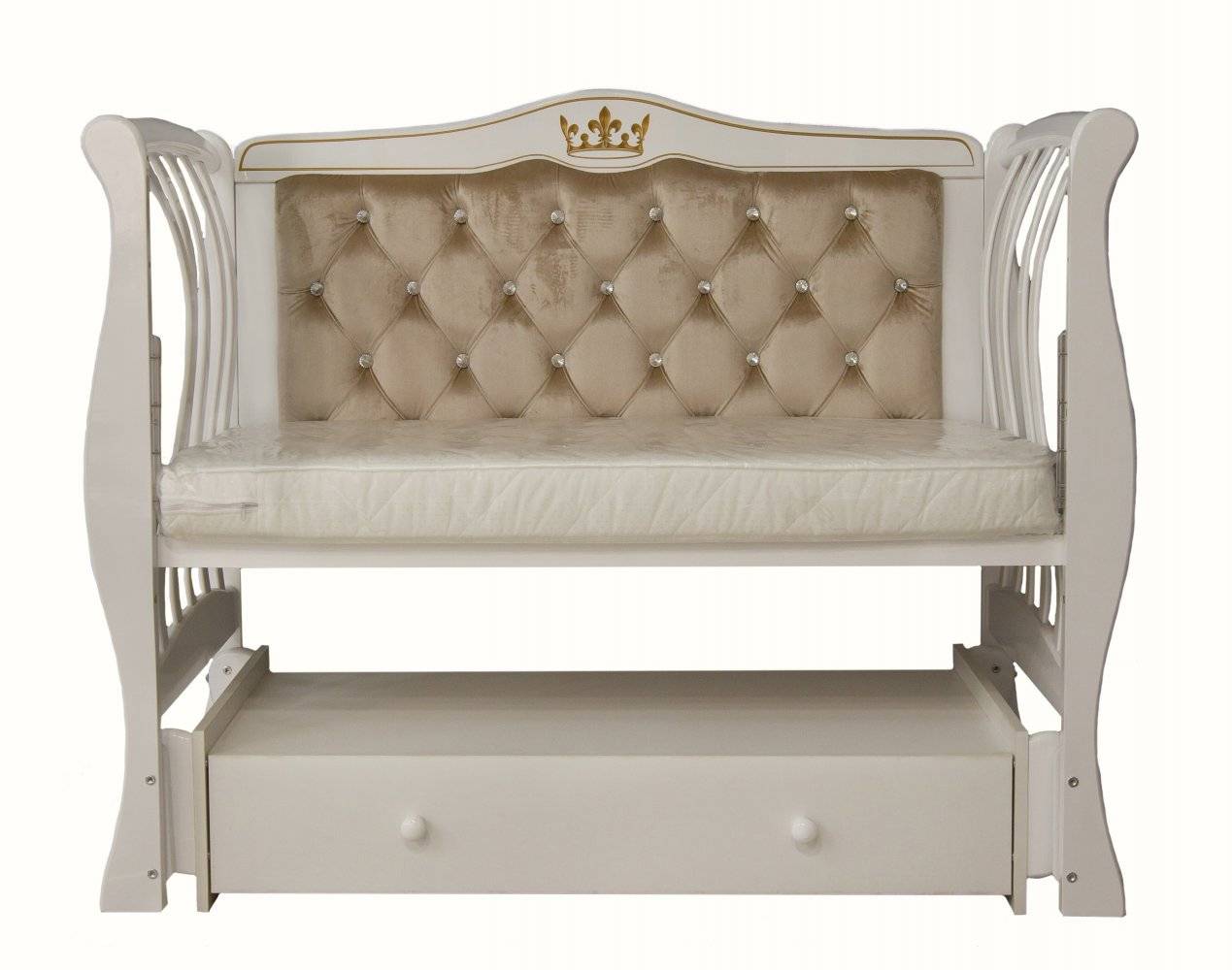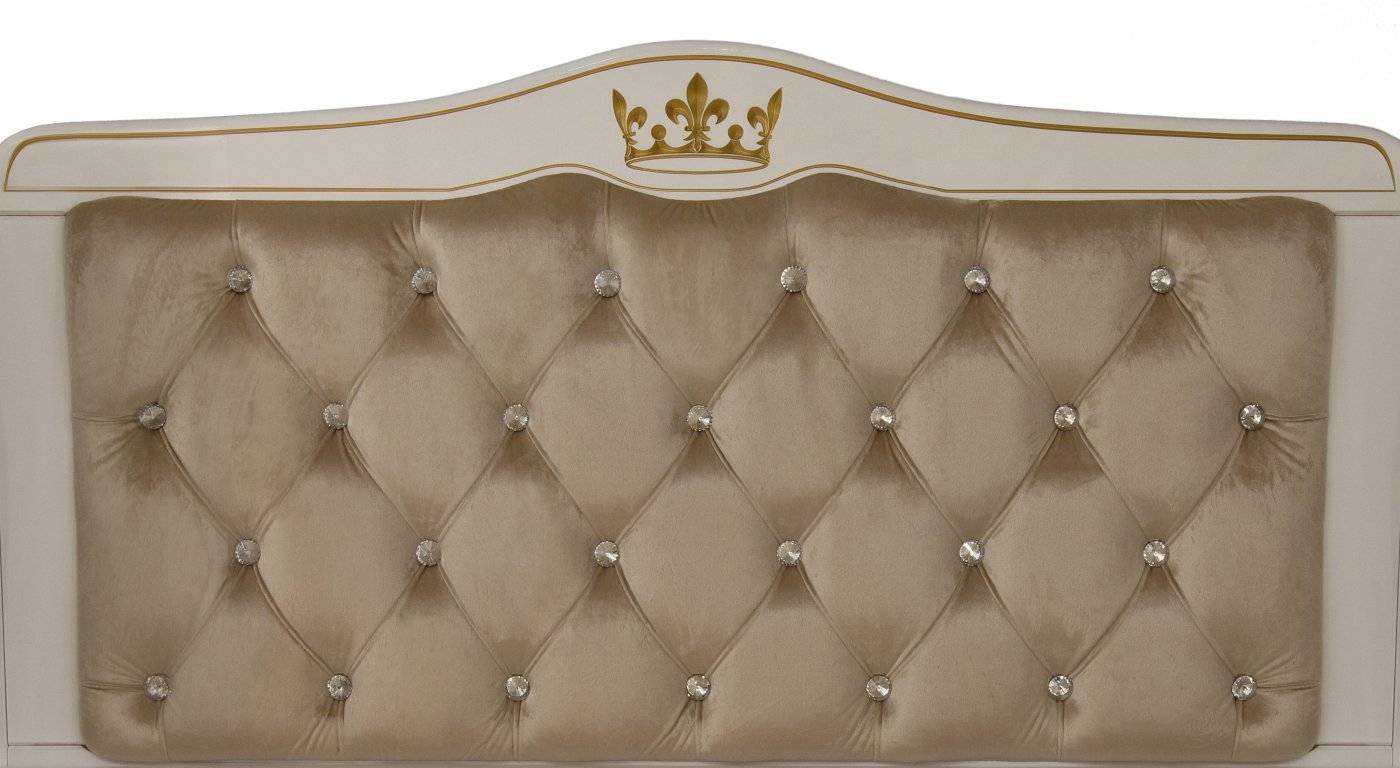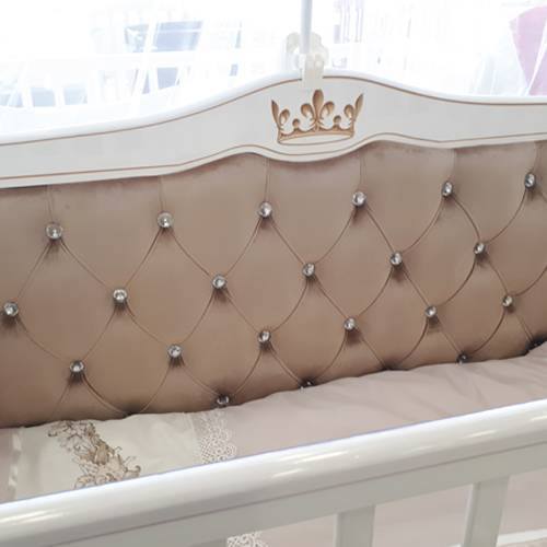 Спинка кровати декорирована тканью и украшена стразами, которые поблескивают когда на них попадает свет. Последний штрих изысканная резьба (декор под позолоту) и кроватку венчает резьба в форме короны.
